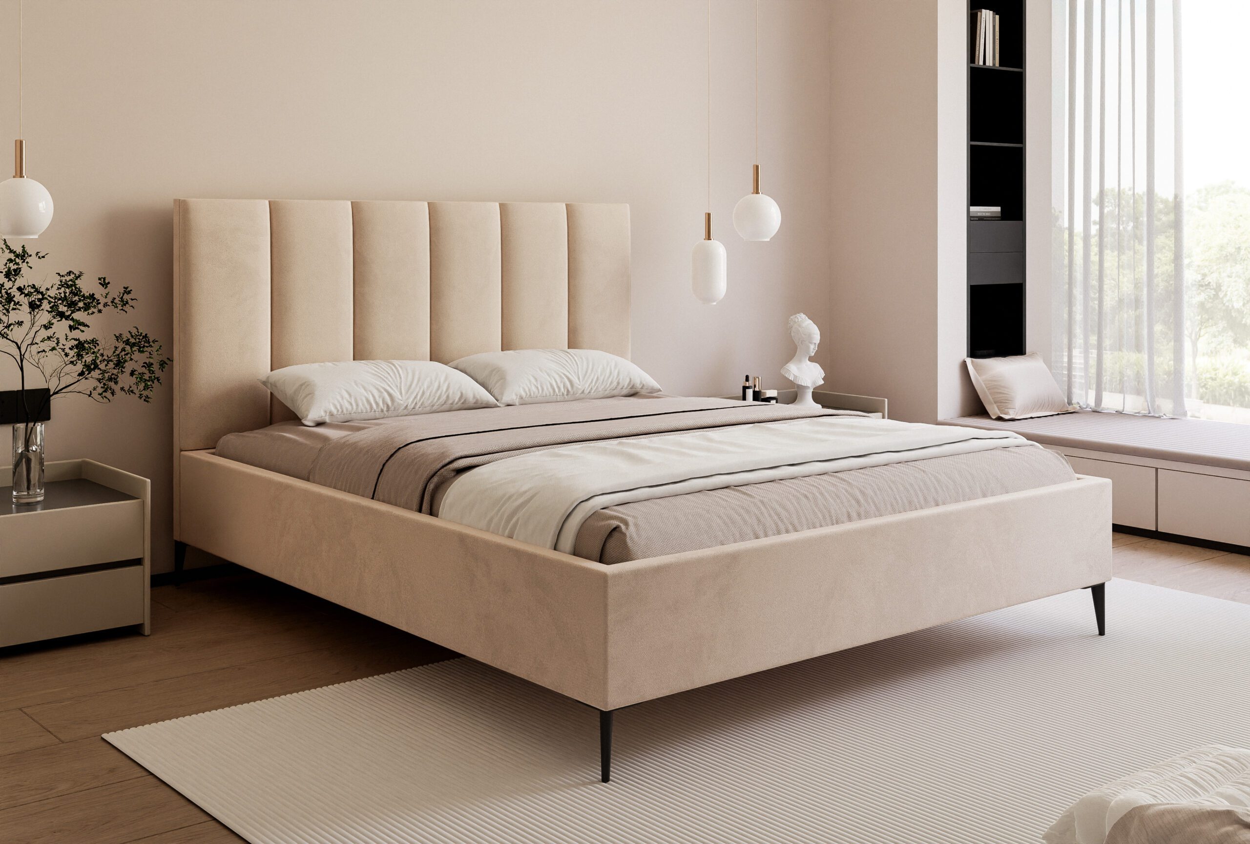 Papildomas šio modelio privalumas – aukštos kojelės, kurios pakelia lovą nuo grindų. Tai ne tik estetikos klausimas – po lova atsiranda vietos, kurią lengva valyti, o pats dizainas atrodo lengvas ir modernus.