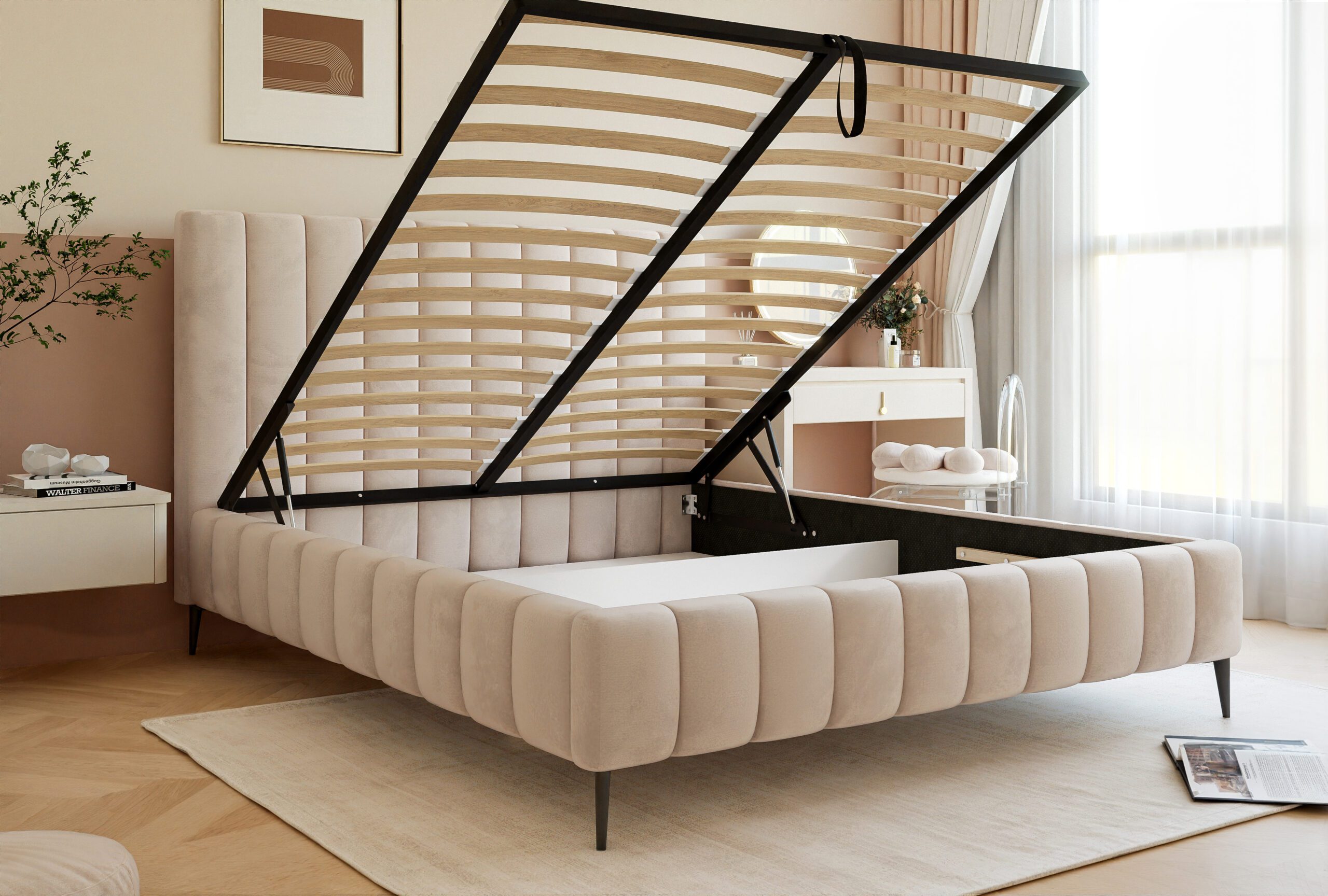Lova turi didelę daiktadėžę, besitęsiančią po visu čiužiniu. Čia galite laikyti antklodes, pagalves ir patalynės komplektus, kad jūsų miegamasis būtų tvarkingas. Vidus apdailintas balta lenta – viskas atrodo tvarkingai ir yra lengvai valoma.
