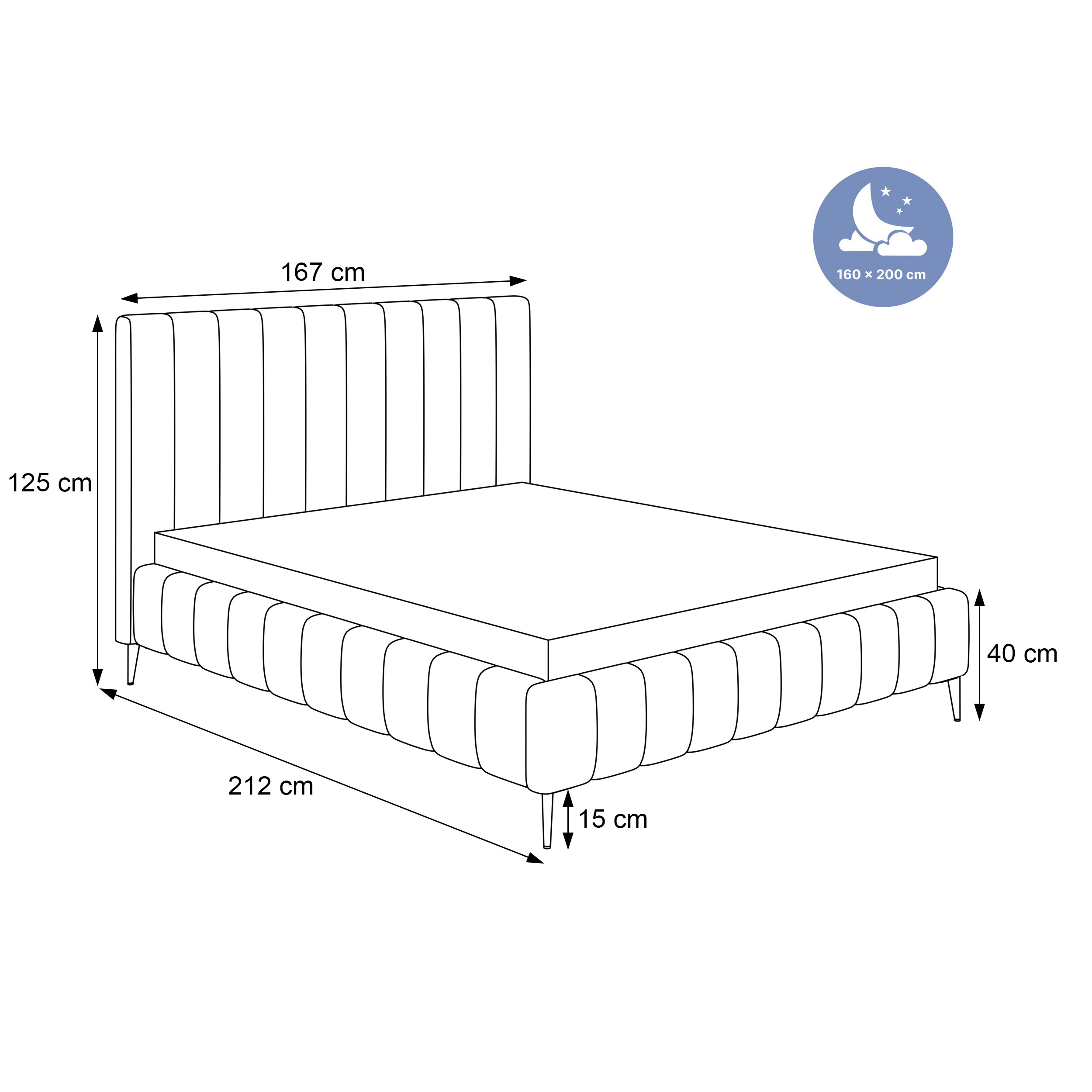 • Lovos šoninės dalies aukštis: 25 cm, šoninės dalies aukštis su kojelėmis: 40 cm